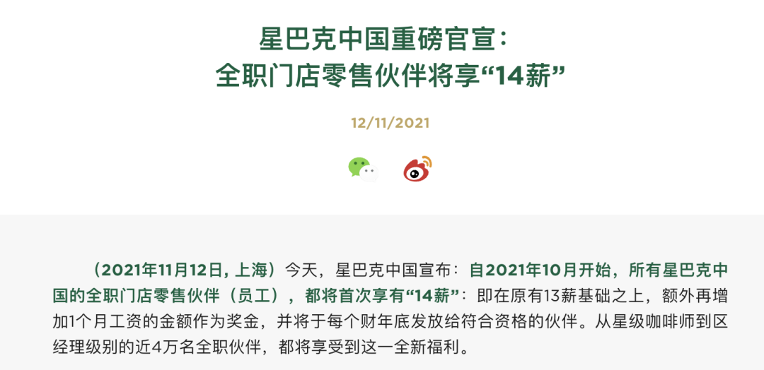 去年11月12日,星巴克中國官網宣佈,自2021年10月開始,所有星巴克中國的全職門店零售夥伴(員工),都將首次享有“14薪”。此外,星巴克中國還推出了包括有競爭力的年度績效調薪、更優化的早晚班津貼、部分城市升級的“助房津貼”額度,以及鼓勵員工到不同城市體驗的“夥伴識天下”計劃等等福利舉措。