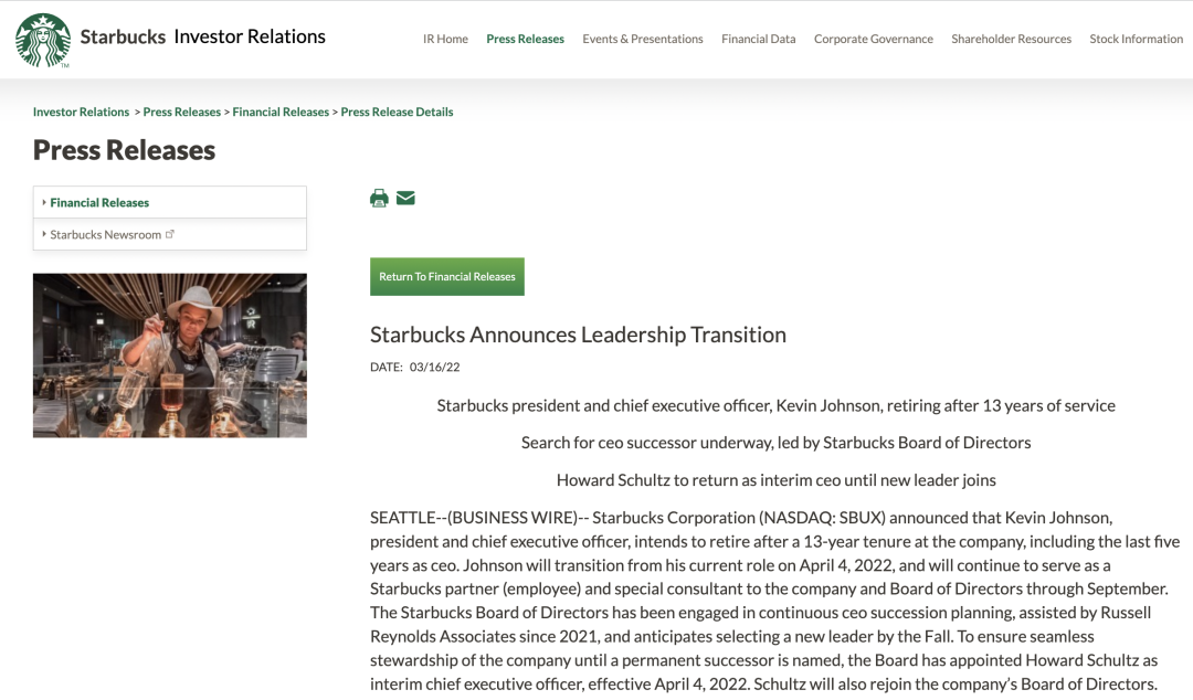 3月17日,星巴克官網宣佈,星巴克現任CEO凱文·約翰遜將於4月4日離職,屆時,現年68歲的星巴克創始人霍華德·舒爾茨將加入董事會並出任代理CEO,重新掌舵這家全球咖啡巨頭。