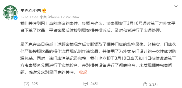 就在今年315前夕,即3月12日,星巴克再次因為食品安全問題登上微博熱搜。一位網友發佈圖文稱,自己在星巴克咖啡中喝出了蟑螂。星巴克中國官方微博再次回應稱,“涉事顧客於3月10號通過第三方外賣平台下單了飲品……未發現相關蟲害問題。”