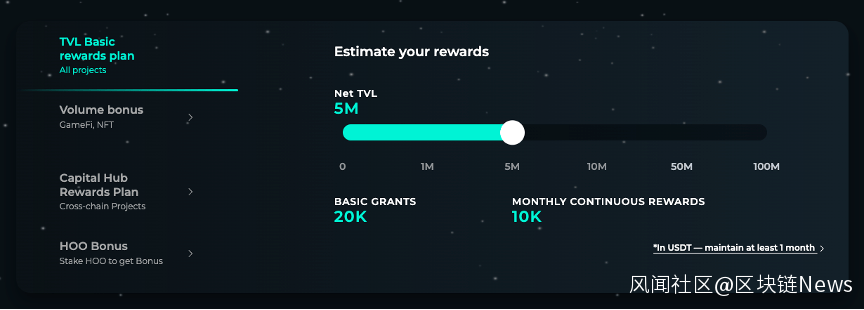 例如,某項目TVL達到100萬USDT量級,同時項目中還質押了10萬枚以上的HOO,那麼其在獲得TVL(總鎖倉價值)獎勵方案之外,還可額外獲得10%質押HOO的獎金。