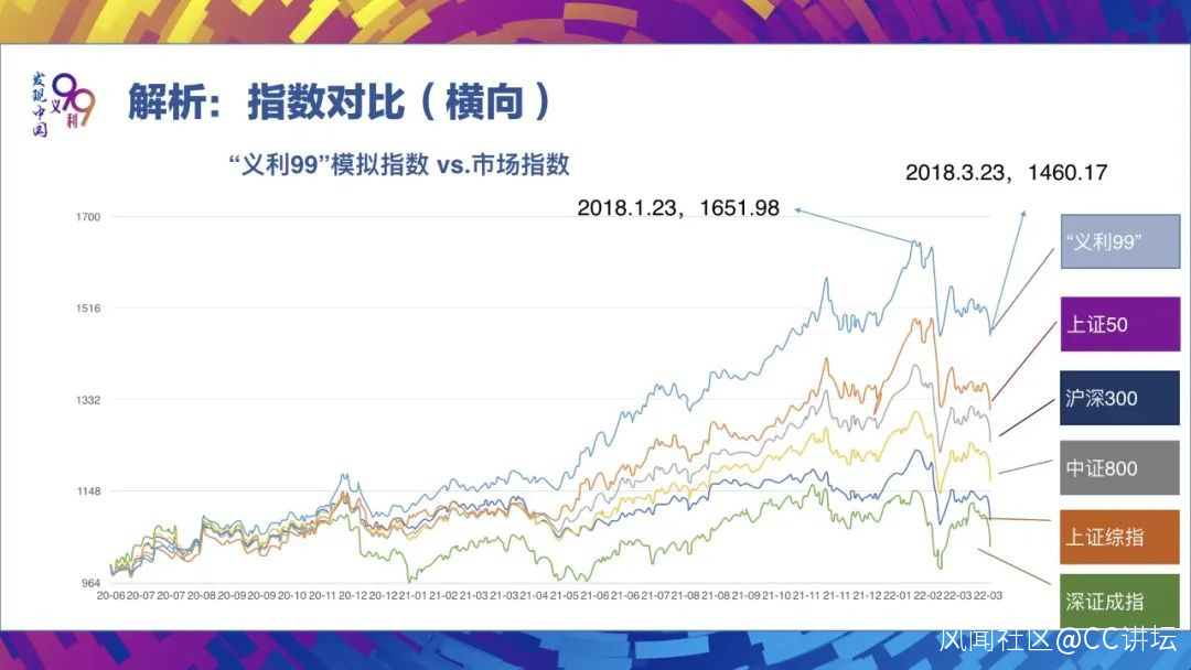 我們看在過去的近二十個月當中,一路走高,我們再看看這樣一個講價值觀的義利並舉的指數跟市場的指數相比,結果又怎麼樣呢?