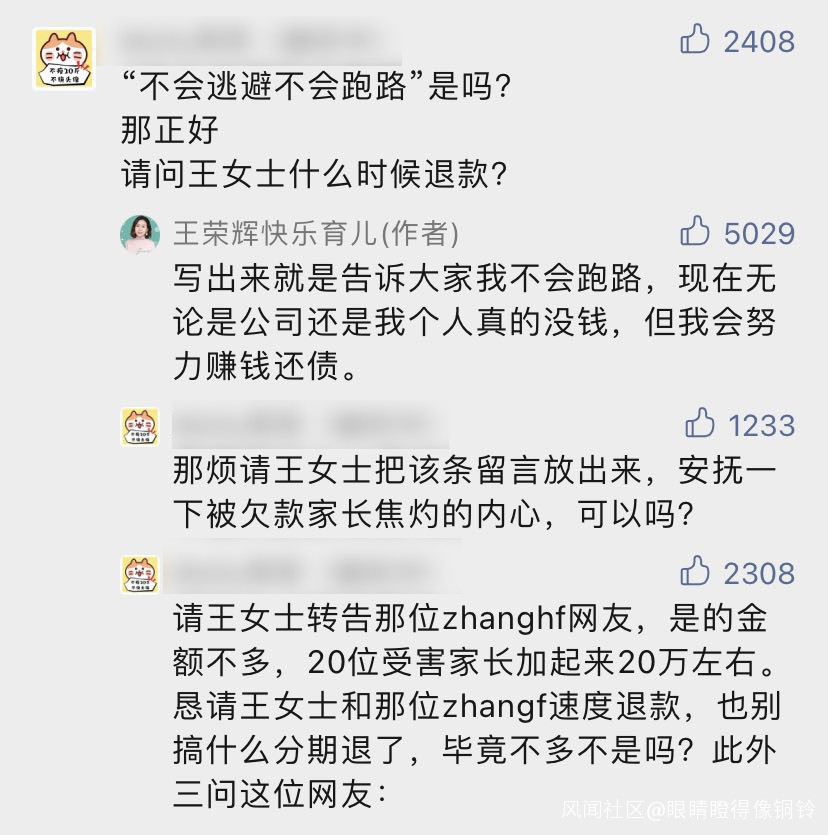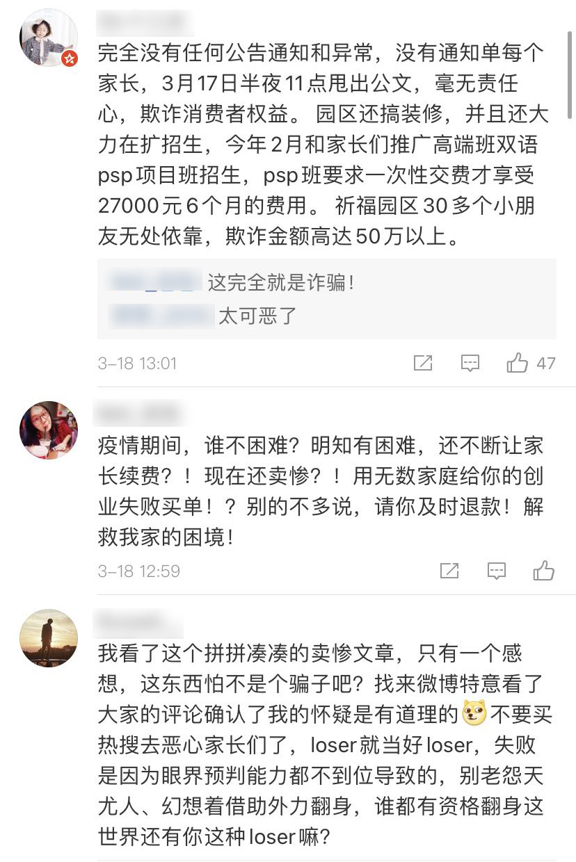 看了眼評論區,如同她原文裏説的“家長也開始唾罵我,侮辱我,詛咒我,上門敲鑼,拉橫幅圍堵,上門脅迫退款”,有很多家長在評論裏説,該機構不履約退款。