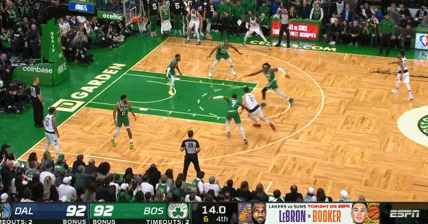 上一場在北岸花園,幾乎是同樣的劇情,東契奇吸引傳給丁威迪。