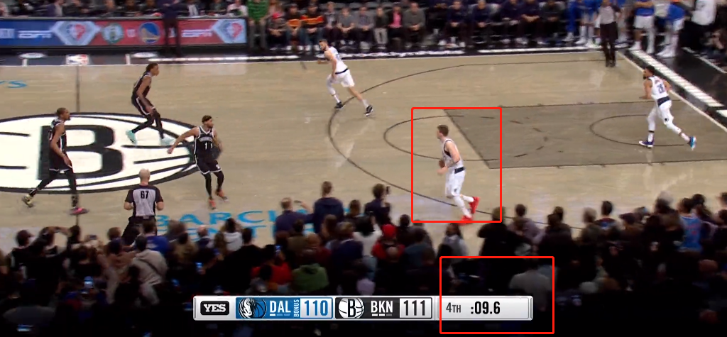 比賽還剩10秒,獨行俠暫停回來後場發球,東契奇慢悠悠運到前場。