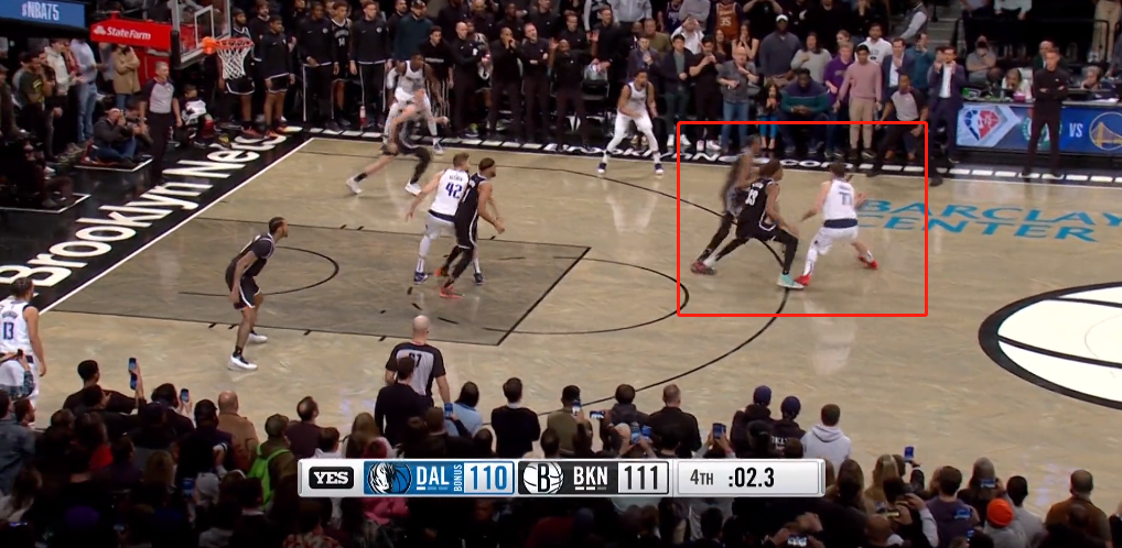 第四節最後22秒,東契奇翻身後仰打進,獨行俠110-108領先籃網2分之後,杜蘭特持球過半場和布朗在logo右側位置發起擋拆,如此高的位置,獨行俠依然選擇夾擊。