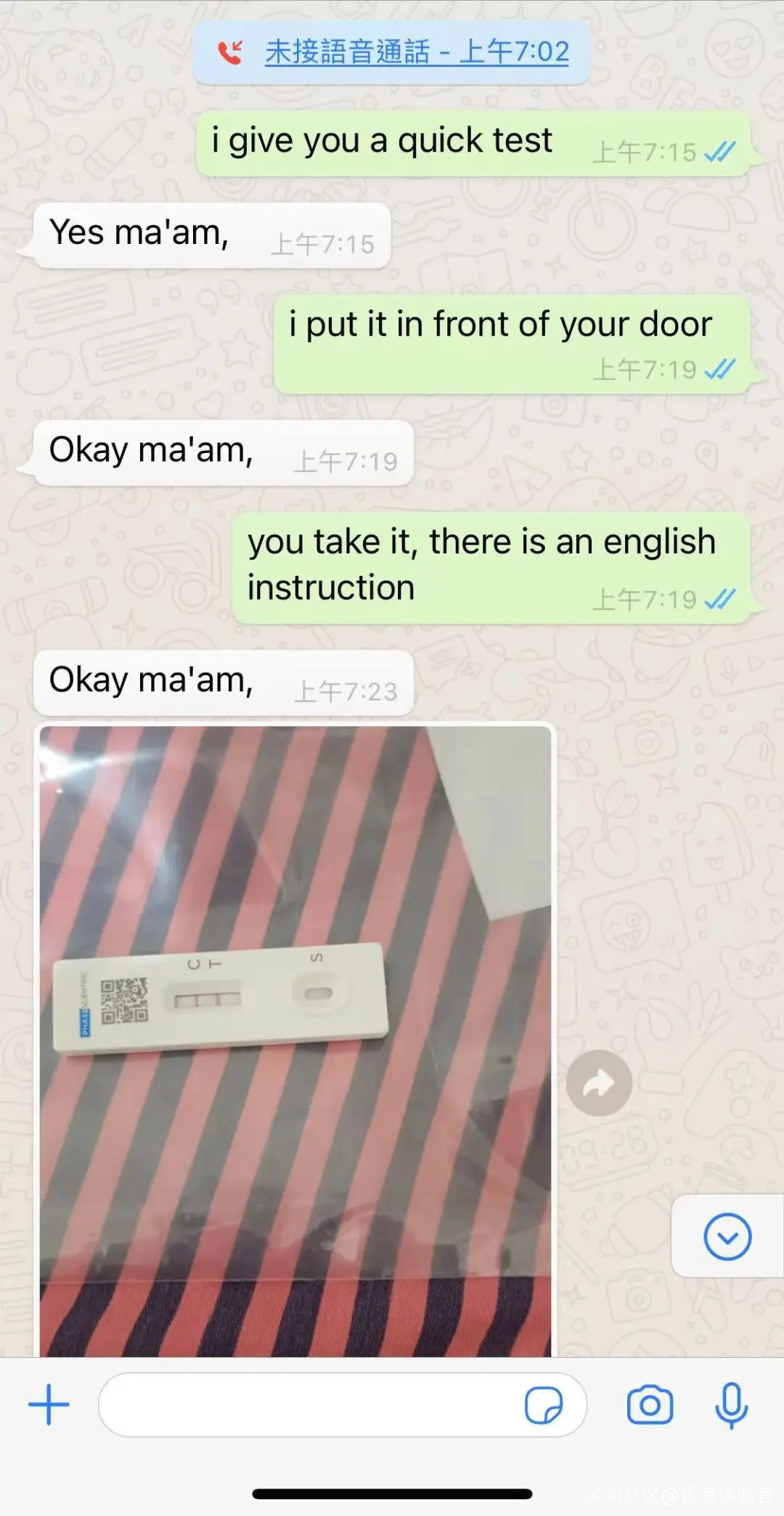 第8天,也就是3月7日,我給工人姐姐一個快測棒,她測試結果是陰性。