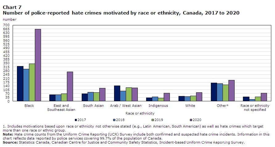 在所有組別的仇恨犯罪中,針對黑人的約佔40%,比2019年增加了92%。而針對原住民的案件增加了152%,增長幅度僅次於針對東亞裔和東南亞裔的仇恨犯罪。