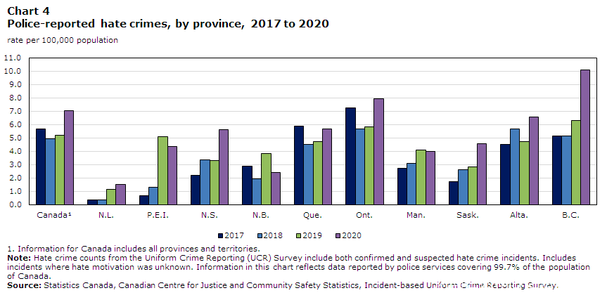 △2017年到2020年 加拿大及各省仇恨犯罪變化柱狀圖