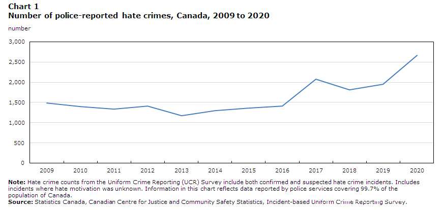 根據這份報告,2020年,警方登記在案的仇恨犯罪中總數為2669起,比2019年增加了37%,這也是自2009年開始此項登記以來,案件數量最多的一年。