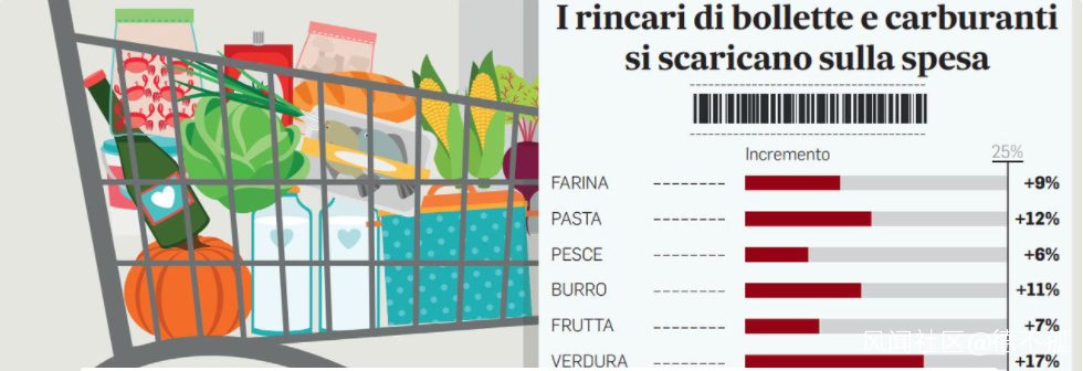 由於對俄羅斯實施的制裁措施,導致意大利乃至整個歐洲消費賬單、汽油和柴油的價格飆升,達到每升2.4歐元的峯值,成本的增加全部呈現在老百姓的購物車裏。意大利農耕產業使用的肥料中,有60%的鉀肥從加拿大進口,剩餘40%的鉀肥來自白俄羅斯和俄羅斯,當前該價格有進一步飆升的風險。而氮肥和磷肥的價格現在也已經高到不可控制了。挪威化肥巨頭Yara對此發表聲明稱:“根據我們最極端的計算,歐洲如果不使用足量的化肥,農作物產量可能會減少多達50%。當前烘焙行業已經處於戒備狀態。它們承擔了雙倍的成本,現在最害怕的是沒有足夠的原材料可用。”