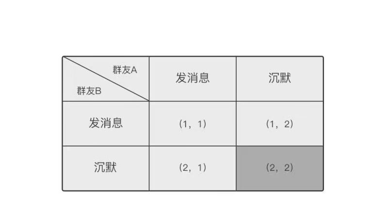 4、羣友A和B就想,不如干脆等別人如C來發消息,收益矩陣是(2,2);