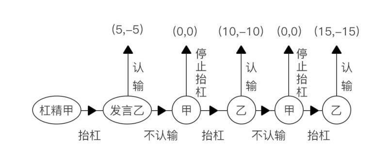 3、乙不認輸,甲拒絕停止抬槓,繼續抬槓第三次,乙如果認輸,前三期發言不僅白費,還被槓精甲涮了三道,收益矩陣為(15,-15);