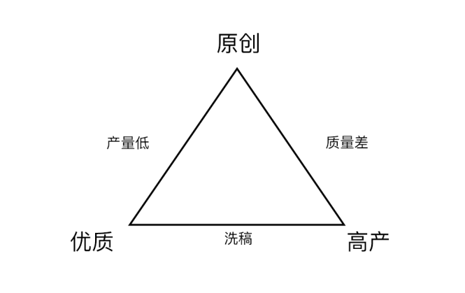 由於輿論市場的消費結構遵循二八定律,生產結構遵循創意稀缺原理,輿論圈形成了一個更大的不可能三角。