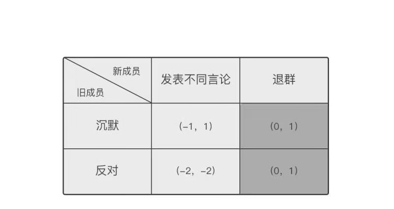 1、新成員發表差異化觀點,老成員不喜歡,但是出於禮貌保持沉默,新成員看到沒有人回應,感到無趣,收益矩陣是(-1,0);