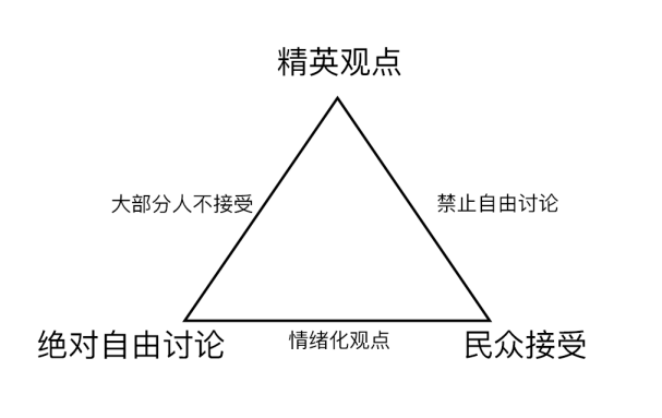 為了把精英觀點強迫灌輸給大多數人,就得禁止自由討論,精英立場變成手握權力的官方觀點。
