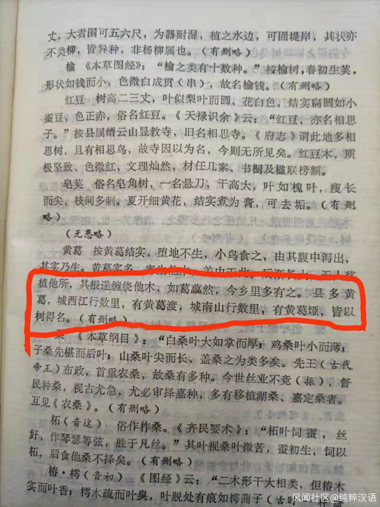 林鴻榮先生解釋,黃是“老樹“之意,葛在《詩經》中就存在。《詩經·周南·樛木》曰:“南有樛木,葛藟累之……”(南方有一種樹枝彎彎的大樹,是因為葛藤(藟)的攀繞而壓彎的)。因此,“葛”是“老樹葛藟”演化而來。