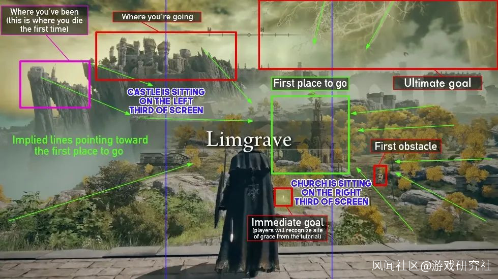 圖片裏展示的是玩家站在寧姆格福時見到的景象。帖子的作者則試圖通過給重要地點、敵人打上箭頭和方框的方式,向其他玩家們説明From Software早就已經給你埋下了足夠的視覺線索和引導。
