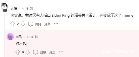 網友們的樂子在於,原作者好像並不清楚給玩家適當的引導是一個遊戲的基本設計概念。他感到老頭環的設計優秀沒錯,只是他的解釋讓人聽起來像有人在跟你説:“你想喝水,那是因為你渴了”。