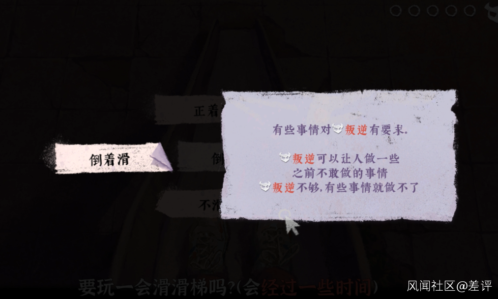 同樣有着影響遊戲劇情的效果,在遊戲中一些比較 “ 出格 ” 的決定,必須累計足夠的叛逆值才能完成,比如倒着滑樓梯。