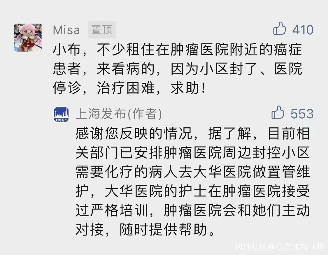 上海發佈評論區截圖3月17日,有網友在上海發佈評論區留言諮詢:上海不少租住在腫瘤醫院附近的癌症患者,來看病的,因為小區封了、醫院停診,治療困難,望求助!