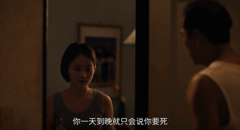 短短四句無效的單向溝通,和雙人牀上方的婚紗照形成互文,道出他們的“熟悉又陌生”——