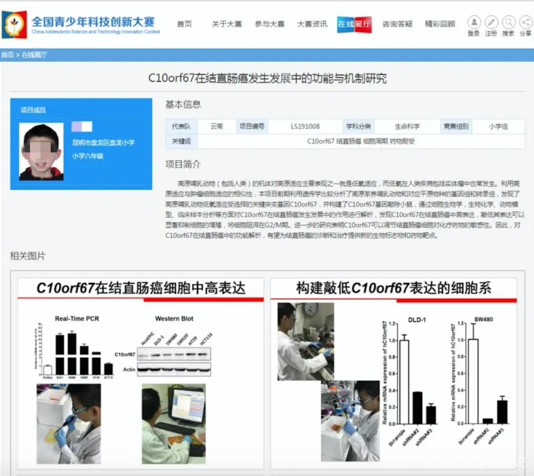 雲南一小學生憑藉“癌症研究”獲獎,後因違規被撤銷獎項。圖源:全國青少年科技創新大賽網站