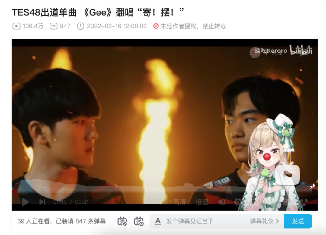 與此同時,由於電競愛好者玩家的湧入,與電競相關的用户產出內容大量增多,也與站內文文化出現了融會貫通。虛擬歌姬UP主蛙吹Keroro為TES戰隊“整活”的5首應援曲平均播放量達到均超過了10萬,其中最高的播放量達到了136萬。