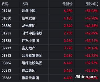 板塊方面,地產股領漲,融創中國漲超59%,龍光集團漲超42%,旭輝控股、世茂集團漲超32%,碧桂園漲超28%;