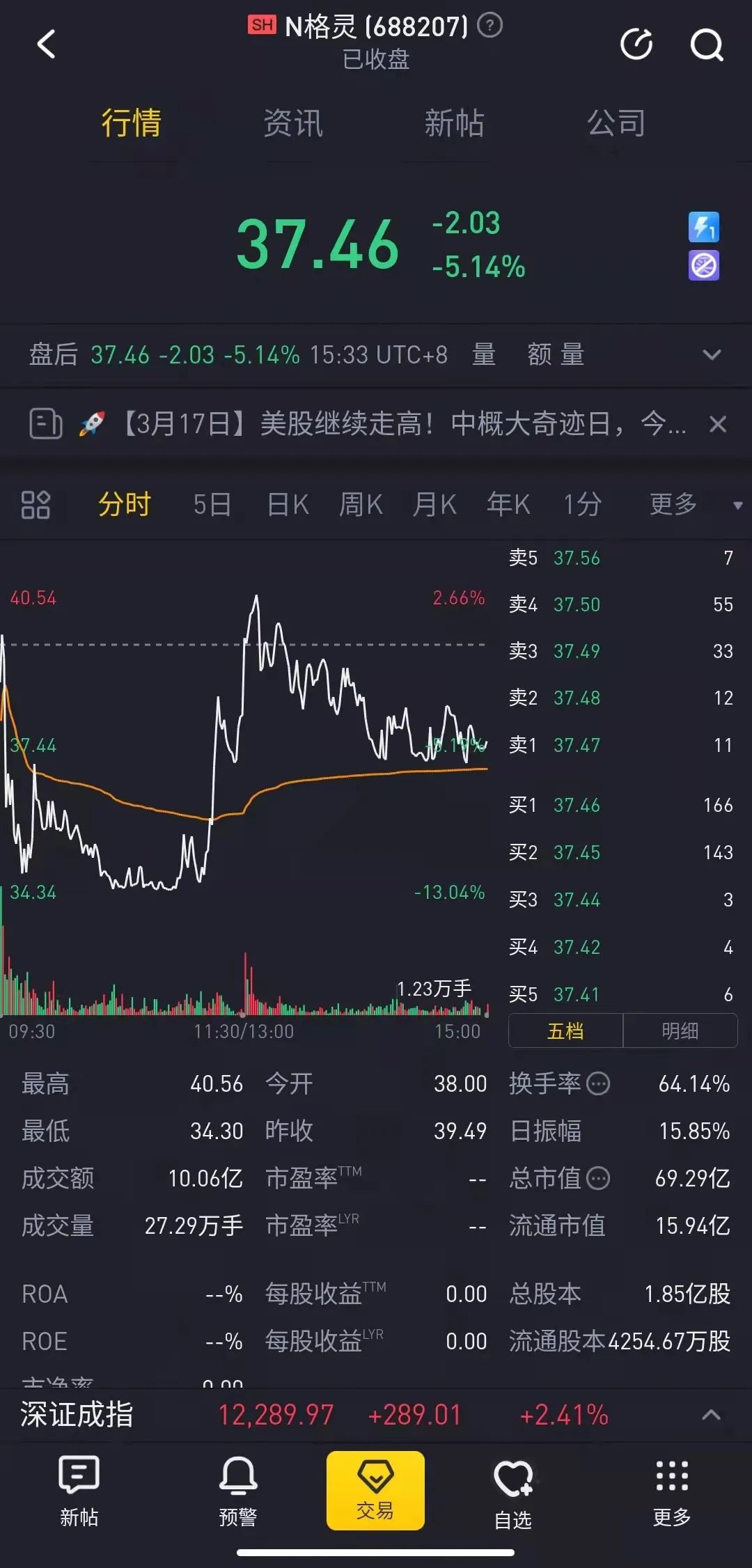 截至收盤,格靈深瞳股價報收37.46元/股,較發行價下跌5.14%,市值約為69億元。