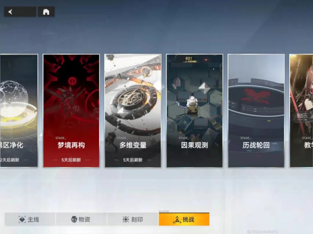 “主線”“物資”“刻印”標籤下大多是較為普通的戰鬥模式,算是為養成提供的素材本。“挑戰”標籤下的不同模式就玩法各異了