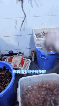 洗菜池骯髒不堪,食材用盆和桶,堆放在水池附近。
