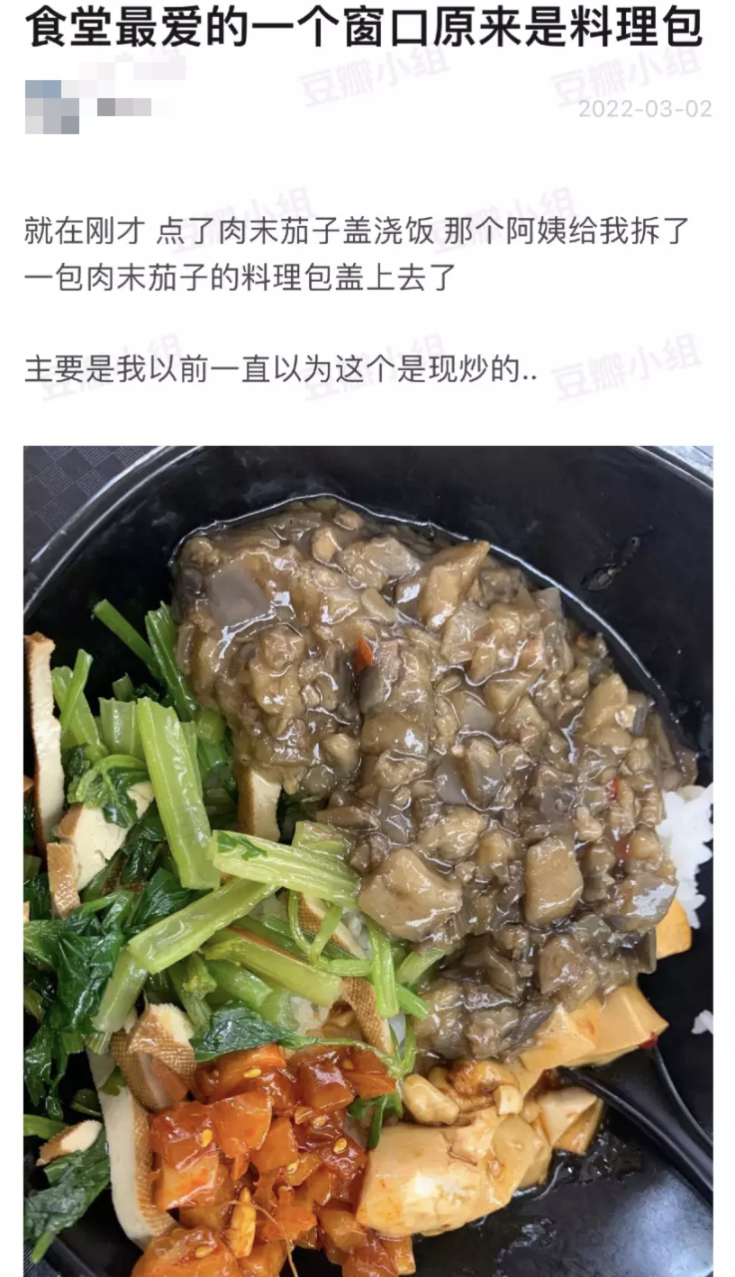 食堂裏經常吃的窗口,賣的菜都不是現炒的,而是料理包……