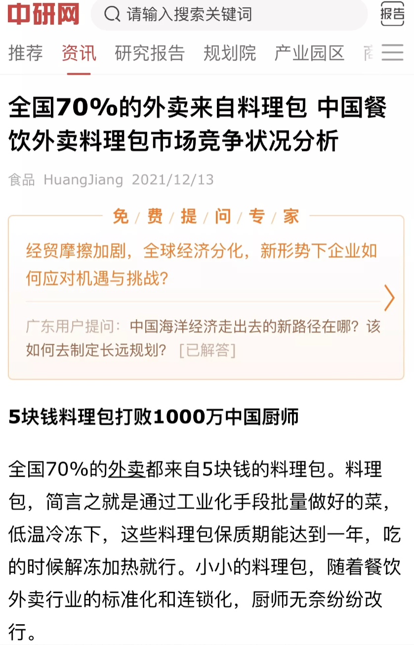 “全國70%的外賣來自料理包,5塊錢料理包打敗1000萬中國廚師。”