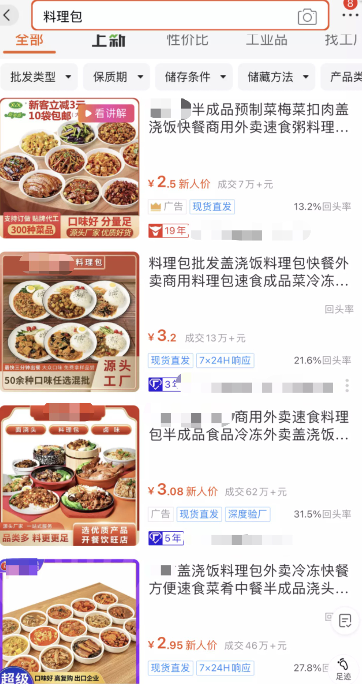 而這樣的料理包,在某軟件上搜索發現,成本低到每包不到3元。