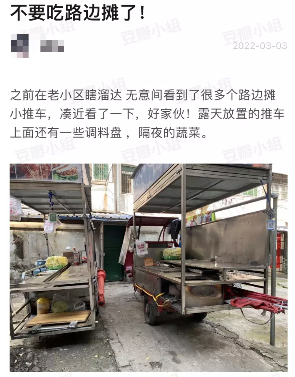 路邊攤的小車隨意停在露天環境裏,調料盤、隔夜菜都直接暴露在户外;