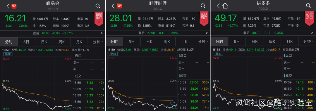 截止4月23日美股收盤,唯品會、嗶哩嗶哩、拼多多等股價跌幅均超過5%,阿里巴巴跌幅亦超過2.2%。
