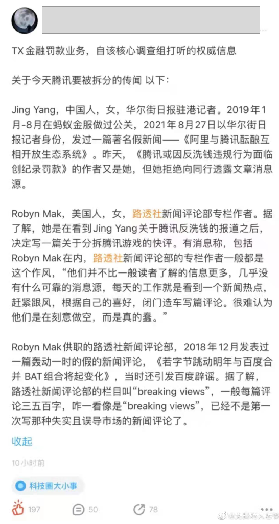 據悉,這篇文章,實際上是路透社一名編輯,看了一名同事寫的有關騰訊面臨鉅額反洗錢罰款的文章後,寫的一篇讀後感。