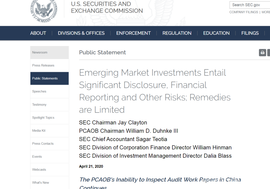 2020年4月23日,克萊頓和四位美國證券界大佬,共同發佈了一份報告,指責中概股“信息披露上有****問題”,要求投資者遠離在美上市的中概股。