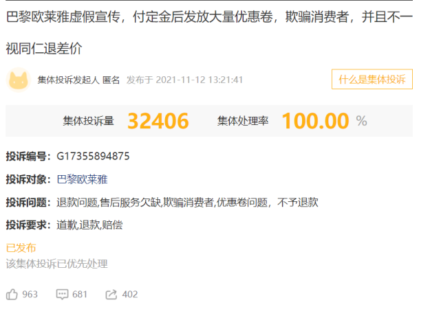 歐萊雅投訴量遙遙領先,與李佳琦、薇婭的爭議有關。2021年11月18日,多條與歐萊雅、薇婭和李佳琦相關的詞條停留在熱搜上。