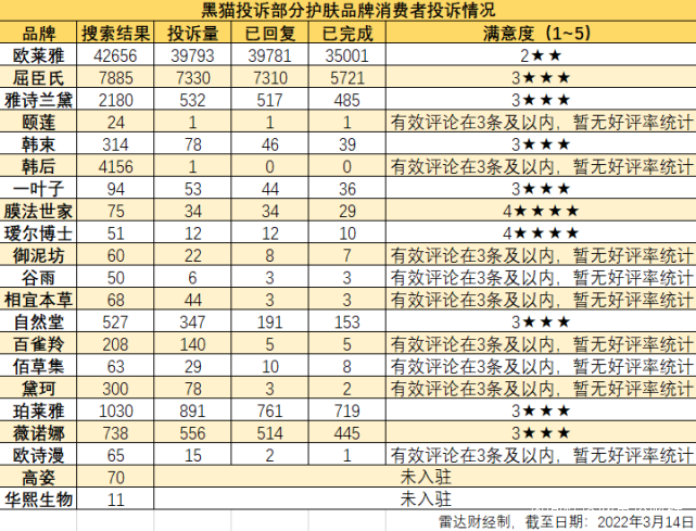 雷達財經以截至2022年3月14日的黑貓投訴平台上的數據,統計了21款護膚品品牌的消費者投訴記錄,歐萊雅以39793個投訴,位列被投訴榜單第一。