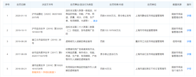 2019年6月,公司因虛假或引人誤解的商業宣傳被重慶市江北區市監局罰款。同年8月,公司因違反相關規定,發佈虛假廣告被靜安區市監局罰款20.60萬元,並被責令停止發佈。10月,再次因違反相關規定,發佈虛假廣告被上海市市監局罰款133.20萬元。