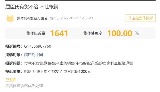 消費者同樣在黑貓投訴中發起了集體投訴,投訴量達1641條。