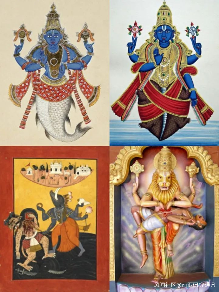 毗濕奴化身靈魚(Matsya)、神龜(Kurma)、野豬(Varaha)和人獅(Narasimha)。圖源:“南亞觀察”微信公眾號