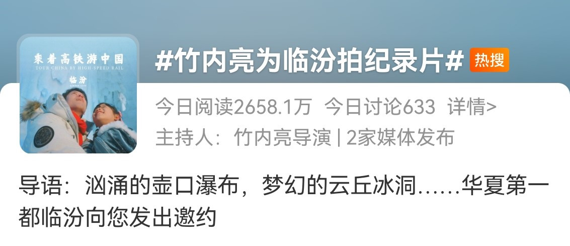 2月15日,由日本導演竹內亮執導,解讀中國工作室、高和傳媒、和之夢聯合制作的微紀錄片《乘着高鐵遊臨汾》在央視頻、騰訊視頻、西瓜視頻等海內外新媒體平台上線播出,並登陸全國高鐵列車熱播。