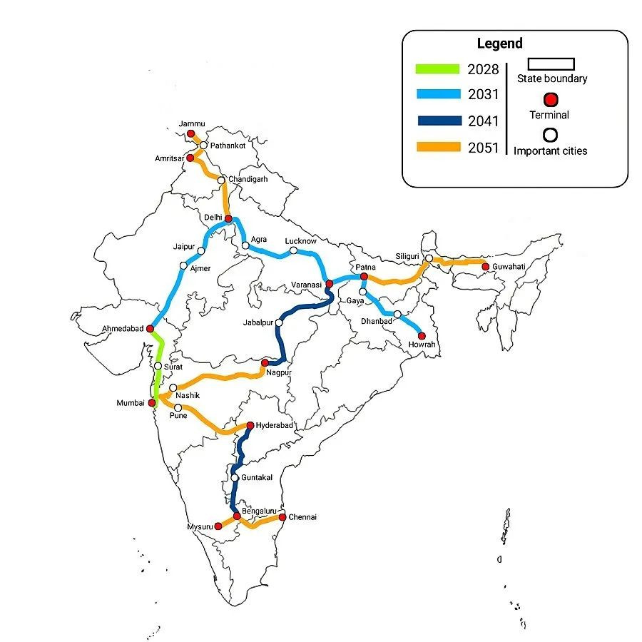 印度的高鐵線路規劃及通車時間。圖源:“隨水文存”微信公眾號