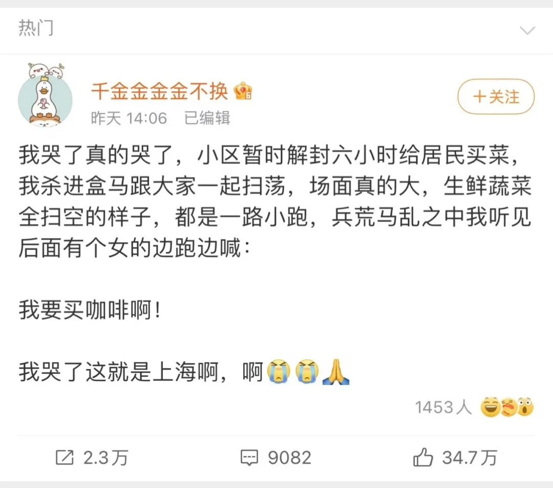 看到這熱搜前,因為小區暫時不封,家裏從不喝咖啡的福建人,非常友好地邀請我,走,要不要出去喝杯咖啡?這情況實屬罕見,結婚這麼多年了,也就今年出現一次。