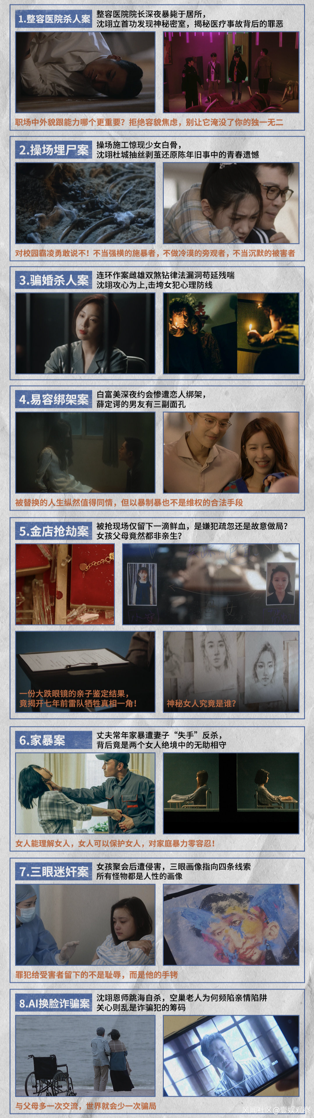 比如,校園埋屍案和千面綁架案中間用一集左右的篇幅,穿插了騙婚殺人案;15集在AI詐騙案和連環爆炸案之間,用了一集左右的時間,講述了女模特蕭珊照片被破壞的故事。