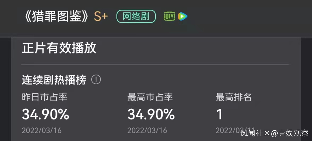 週三會員收官日,《獵罪圖鑑》在愛奇藝站內熱度值突破8926,收官後的第二天熱度依然不減,維持在8800+。根據雲合數據顯示,會員收官日《獵罪圖鑑》的正片有效播放市場佔有率高達34.9%,位列連續劇熱播榜的第一位。