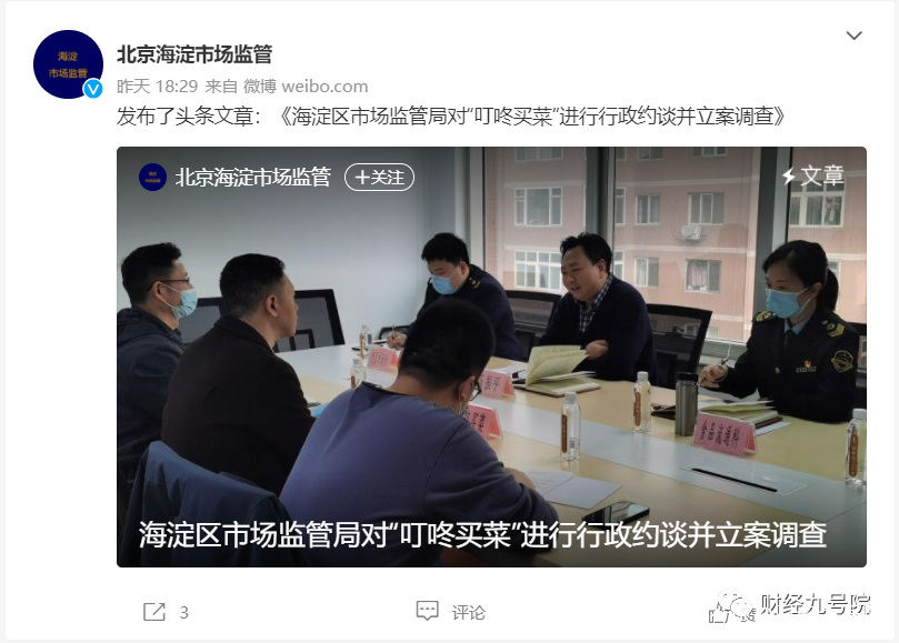 北京市場監管部門在對叮咚買菜北京運營主體北京不姜就電子商務有限公司負責人進行行政約談的同時,還對該公司進行立案調查。此外還對轄區內其他生鮮電商平台開展專項檢查。