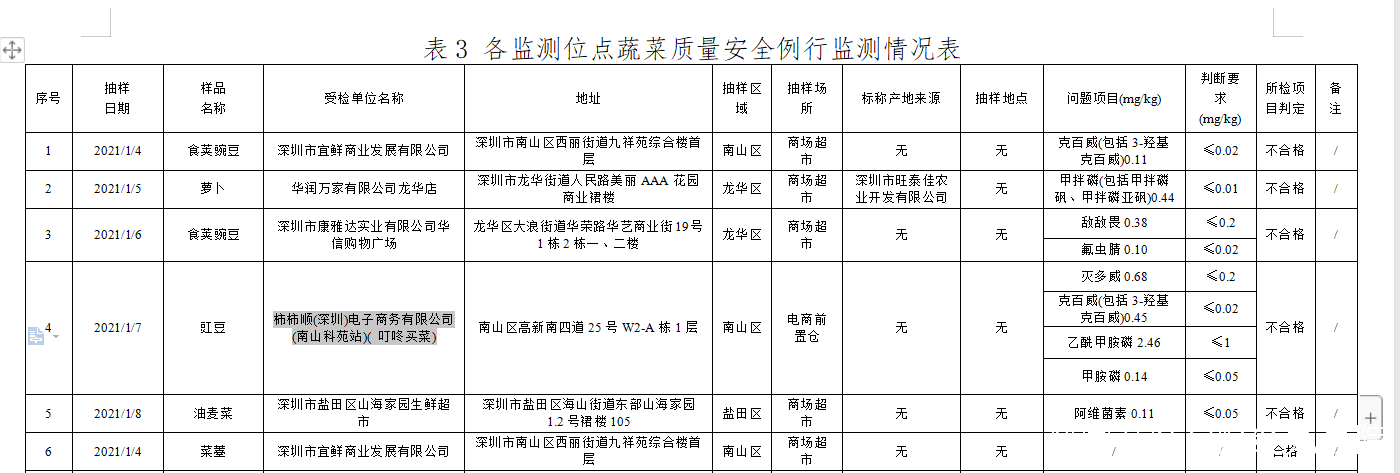 如,2021年1月7日從柿柿順(深圳)電子商務有限公司(叮咚買菜南山科苑站)抽樣的豇豆被檢測出滅多威(0.68,檢測標準≤0.2,下同)、克百威(0.45,檢標≤0.02)、乙酰甲胺磷(2.46,檢標≤1)、甲胺磷(0.14,檢標≤0.05)等多種農藥超標,且超標2倍到20多倍不等;